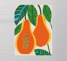 Un'illustrazione vivace e stilizzata di papaya a fette con foglie verde scuro su uno sfondo chiaro. Il motivo ripetitivo e il colore arancione brillante creano un'atmosfera fresca e tropicale.