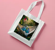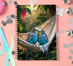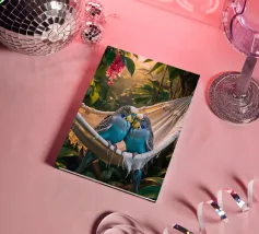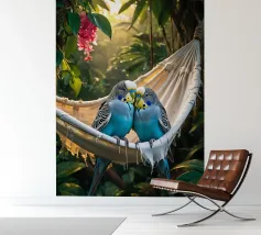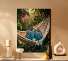 Due pappagallini si accoccolano l'uno all'altro su un'amaca in mezzo al verde. Le loro teste sono leggermente inclinate, come se sussurrassero segretamente che, dopo tutto, questo è davvero il posto migliore del mondo. Perfetto per chiunque voglia portare un po' di allegria e amore nella propria casa.