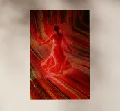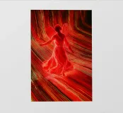 Questo motivo è uno straordinario esempio di arte digitale che utilizza il light painting e crea un'atmosfera mistica, quasi trascendentale. La figura dell'angelo, disegnata in una luce rossa incandescente, sembra muoversi in un flusso di linee ondulate che ricordano l'oro liquido e la lava incandescente. L'opera gioca magistralmente con gli effetti visivi del bagliore e del movimento in un'estetica futuristica. È un'immagine affascinante che trasporta l'osservatore in un'altra dimensione e porta una potente energia eterea nella stanza.