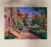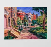 Una strada alberata in un quartiere storico della città è immersa nella luce calda e dorata dell'autunno, con case a schiera colorate che creano una scena urbana affascinante e nostalgica.
