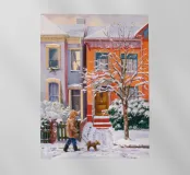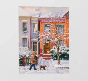 Una persona porta a spasso il proprio cane lungo una strada innevata fiancheggiata da edifici storici in brownstone, catturando un momento di calma e tranquillità della vita urbana in pieno inverno.