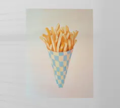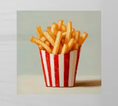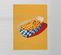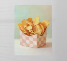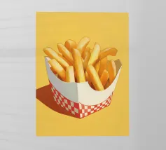 Un'illustrazione creativa di patatine fritte gialle dorate in una scatola a quadretti arancione retrò combina la cultura nostalgica del fast food con un design moderno e minimalista dai colori tenui e pop art. Ideale per qualsiasi cucina!