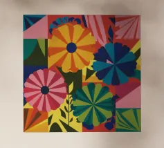 Una bella macchia di fiori selvatici stilizzati e stravaganti è illustrata in un affascinante stile ispirato all'arte popolare, con un delizioso mix di colori e forme che irradiano gioia e bellezza naturale.