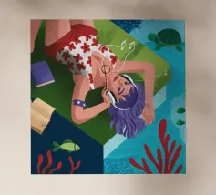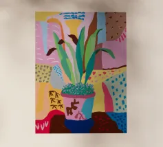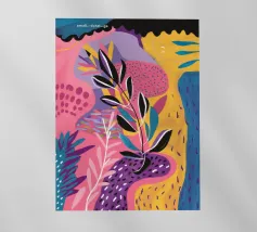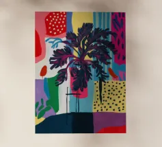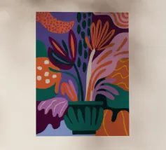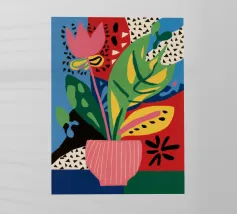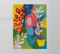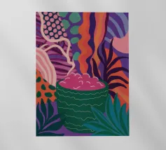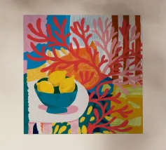 Una composizione astratta presenta una ciotola di fragole in mezzo a un turbinio di forme e motivi organici e colorati, creando un'interpretazione fresca e moderna di un classico dell'estate.