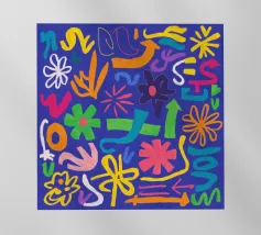 Una composizione astratta presenta una ciotola di fragole in mezzo a un turbinio di forme e motivi organici e colorati, creando un'interpretazione fresca e moderna di un classico dell'estate.