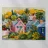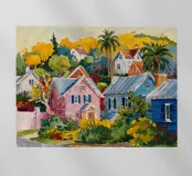 Un villaggio di case colorate di rosa, blu e giallo è adagiato sul fianco di una collina; la scena è composta come un'allegra trapunta patchwork di colori e forme, che emana un senso di comunità e gioia.