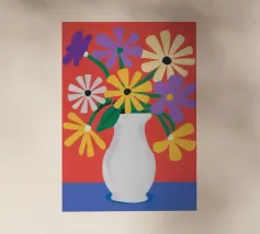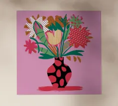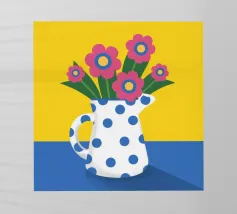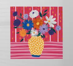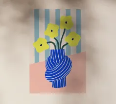 Un vaso a righe bianche e blu contiene fiori gialli e rosa, su uno sfondo vibrante, simile a una trapunta, con motivi floreali rosa, arancioni e rossi.