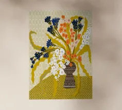 A beautifully patterned vase holds a vibrant bouquet of flowers, with a butterfly resting gracefully atop. The composition features various blooms, including pansies, set against a dark background, highlighting their vivid colors.
