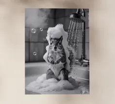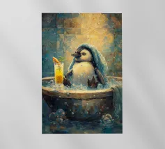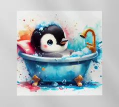 Un pulcino di pinguino è circondato da soffici bolle mentre è seduto in una vasca da bagno. L'ambientazione del bagno e l'atmosfera giocosa creano una scena affascinante e stravagante.