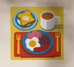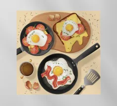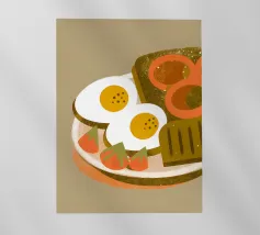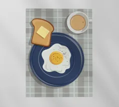 Un'illustrazione semplice e appetitosa di un classico piatto da colazione con un uovo perfettamente fritto, bacon croccante e una fetta di pomodoro su pane tostato.