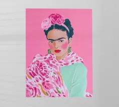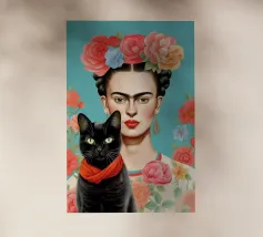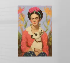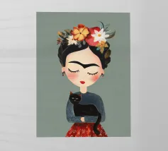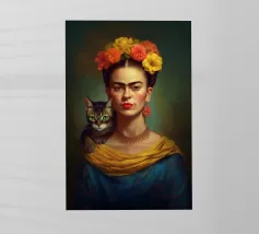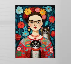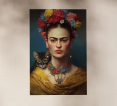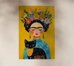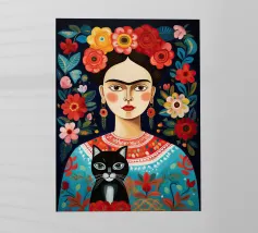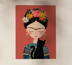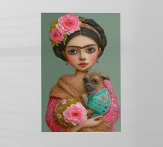 Frida Kahlo indossa la sua caratteristica corona di fiori e le sopracciglia decorate, mentre irradia un'atmosfera sognante con gli occhi chiusi. L'opera, completata dal suo cane e da elementi folcloristici, cattura l'essenza della vita di Frida in un collage creativo di colori e texture.