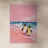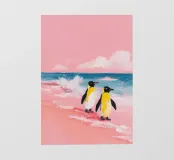 Due pinguini su una spiaggia rosa in un'illustrazione acrilica minimalista. Colori pastello, dettagli semplici, nuvole bianche, onde delicate e cielo rosa. Tavolozza di colori vivaci e giocosi con sfumature di rosa e giallo per un design da parete allegro ed elegante.