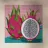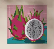 Un'illustrazione audace e grafica di un vibrante frutto del drago (pitaya), tagliato a metà per mostrare la sua splendida buccia rosa e la polpa maculata. Il frutto è collocato su uno sfondo piastrellato rosa, creando un'opera pop art moderna e tropicale.