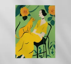 Donna minimalista con cappello, gatto in un mare di papaveri