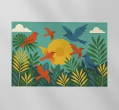 Date un tocco di colore alle vostre pareti con questo poster "Uccelli e sole". Uccelli rossi e blu svolazzano intorno a un sole dorato, circondato da vegetazione tropicale. Un poster retrò luminoso e allegro, perfetto per un look positivo e naturale.