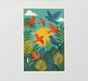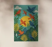 Immergetevi in un'atmosfera tropicale con questo poster Uccelli e sole turchese. Uccelli colorati volano sopra un sole splendente, in un contesto di piante rigogliose. Un poster vintage perfetto per dare un'atmosfera fresca ed esotica alla vostra casa.