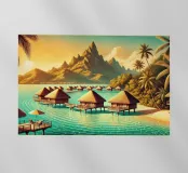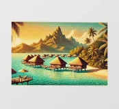 Poster di viaggio d'epoca di Bora Bora, nella Polinesia francese, con una laguna turchese dalle acque limpide e poco profonde, bungalow in legno su palafitte, un molo tranquillo e il Monte Otemanu sotto la luce soffusa del tramonto. Le forme geometriche pulite e la sottile texture della carta creano una stampa costiera senza tempo, ideale per soggiorni, camere da letto, case al mare e case vacanza.