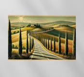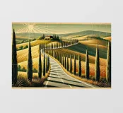 Poster di viaggio d'epoca raffigurante una strada di campagna costeggiata da cipressi che si snoda tra dolci colline, con campi dorati illuminati dal sole, una piccola casa colonica su un crinale e un tenue cielo blu. Le forme geometriche pulite, la delicata texture della carta e la calda tavolozza della campagna creano una stampa rurale senza tempo, ideale per soggiorni, cucine, studi e decorazioni rustiche.