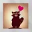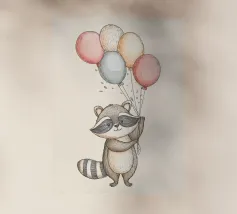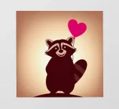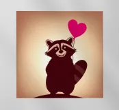 Un affascinante procione tiene in mano un vivace palloncino a forma di cuore, che emana uno spirito giocoso in un design minimalista. Lo sfondo caldo esalta l'atmosfera stravagante della scena.