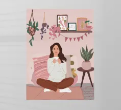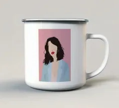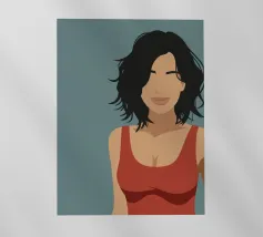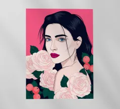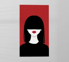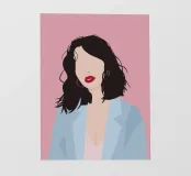 Una donna senza volto con rossetto rosso e capelli neri sciolti posa con sicurezza su un rosa tenue.