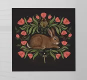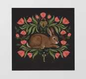 Uno stravagante dipinto di ispirazione folk di un coniglio primaverile circondato da fiori di tulipano rosa con un medaglione d'oro e una chiave scheletrica.