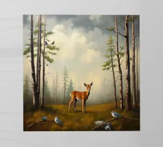 Raffigurazione di due cervi con uccelli in volo in una foresta pellicola backlit