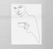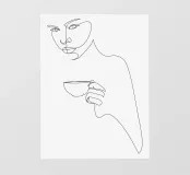Disegno al tratto astratto e minimale di giovane donna con una tazza di bevanda calda