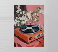 Questa immagine mostra un giradischi in stile vintage dal design chiaro e minimalista. Il giradischi è prevalentemente color pesca con una finitura opaca e un disco verde chiaro sul piatto. Il braccio, che si trova sul lato destro, è anch'esso color pesca con accenti beige e un cavo nero che lo affianca. Lo sfondo è di un colore neutro bianco sporco che si integra con i toni pastello del giradischi. L'estetica complessiva è moderna, con un tocco retrò.