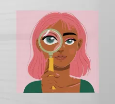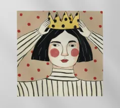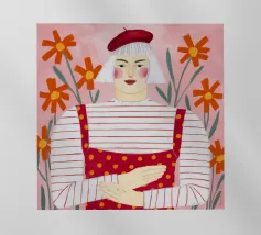 Il dipinto raffigura una persona con capelli corti e scuri acconciati a onde, che indossa un abito con motivi retrò e cerchi e diamanti nei toni del rosa, del marrone e del beige. Lo sfondo è di un semplice colore beige chiaro.