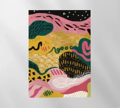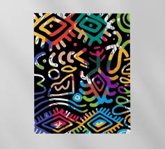 Un motivo dinamico e divertente di forme astratte colorate e di ispirazione retrò è sparso come coriandoli su uno sfondo nero, creando un disegno vibrante ed energico dal sapore vintage.