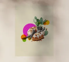 Un collage giocoso e retrò che fonde l'estetica vintage con la cultura pop: una ragazza degli anni '60 in bianco e nero con occhiali tondi e sciarpa si trova di fronte a un cactus mediterraneo, un cono gigante di patatine fritte, una Vespa nera e una ciambella rosa con zuccherini colorati. La composizione è arricchita da audaci cerchi di colore in stile grafico. Perfetta per gli spazi creativi, le cucine moderne o gli interni degli amanti della pop art.