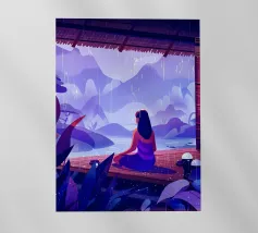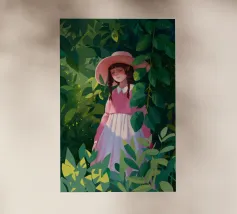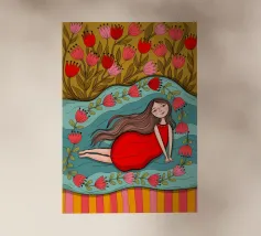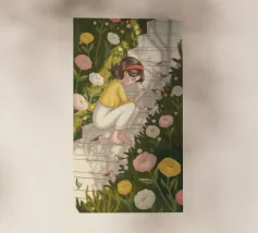 Una persona è seduta vicino a uno stagno, immergendo i piedi nell'acqua mentre legge un libro. Il verde circostante e l'acqua calma creano un ambiente tranquillo.
