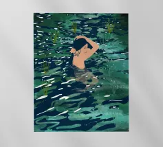 Una persona è seduta vicino a uno stagno, immergendo i piedi nell'acqua mentre legge un libro. Il verde circostante e l'acqua calma creano un ambiente tranquillo.