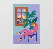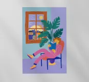 Una donna in posa rilassata si sdraia su una sedia accanto a una grande finestra, godendosi il caldo bagliore del sole al tramonto. La scena è quella di una pacifica solitudine e appagamento, immersa nella splendida luce dell'ora d'oro.