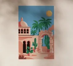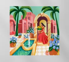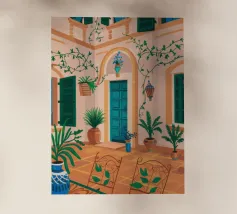 Un cortile con una struttura a cupola blu è ornato da tende fluenti e da una vegetazione lussureggiante. L'atmosfera invitante fonde l'eleganza architettonica con la tranquillità naturale.