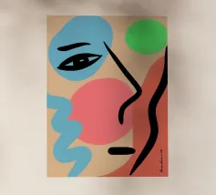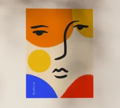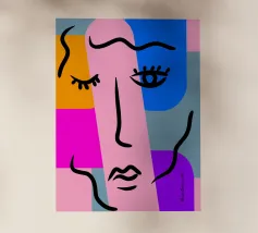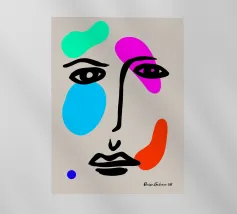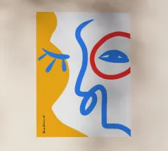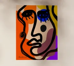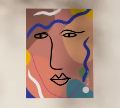 Il ritratto astratto di un volto è creato con linee blu fluide e ondulate su uno sfondo bicolore, dando vita a un'opera d'arte fluida, espressiva e moderna.
