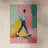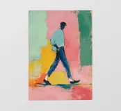 Dipinto a olio di un uomo in pantaloni blu e scarpe bianche su uno sfondo astratto in rosa, verde e giallo. Colori pastello, pennellate e gouache, minimalista, elegante, chiaro ed equilibrato. Alta risoluzione, aree di colore morbide, eleganti e moderne.