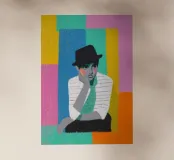 Ritratto di una persona in camicia bianca, pantaloni neri e cappello, seduta frontalmente. Stile di ispirazione matissiana con linee decise, pennellate espressive e uno sfondo di carta piatta e strutturata. Tavolozza di colori: rosa, arancione, verde, blu e giallo.