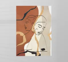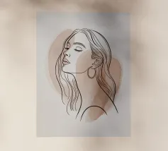 Questa illustrazione minimalista mostra una silhouette femminile di profilo, caratterizzata da linee eleganti e da una tavolozza di colori caldi, con toni beige e crema. I capelli sono rappresentati da tratti sottili e paralleli che trasmettono movimento e consistenza. Lo stile minimalista ricorda il design scandinavo e i manifesti d'arte moderna degli anni Settanta. Le morbide sfumature di colore creano un'atmosfera rilassante e senza tempo, perfetta per gli spazi abitativi che devono emanare eleganza femminile e tranquillità.