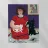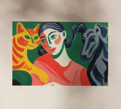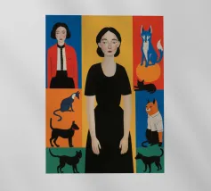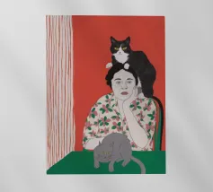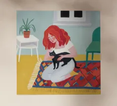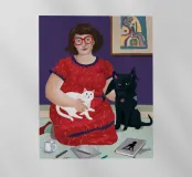 Una donna con occhiali e top rosso abbraccia un gatto nero, seduta su una sedia a motivi rossi su uno sfondo scuro, con vicino materiale artistico e un'opera incorniciata, a suggerire un momento creativo e intimo.