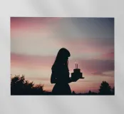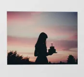 sagoma di una ragazza con in mano una torta di compleanno pellicola backlit