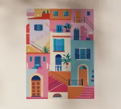 Una ripida scalinata colorata funge da strada in una città mediterranea, fiancheggiata da edifici di colore giallo, arancione e rosa, ornati da piante verdi in vaso.