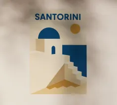 Immergetevi nella magia di Santorini con questo poster minimalista e poetico. Cupole bianche, scale inondate di luce, il Mar Egeo e il tramonto creano uno scenario di totale evasione. Lo stile grafico raffinato e i toni pastello evocano le vacanze, la calma e l'eterna bellezza delle isole greche. Appendetelo e fuggite semplicemente guardandolo.