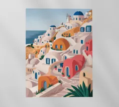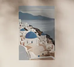 Design di viaggio minimalista della Grecia con le famose case bianche dell'isola greca di Santorini, le rocce vulcaniche e il blu del Mar Mediterraneo. Tipiche case graziose come nei villaggi di Oia e Fira.