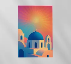 Poster retrò di Santorini, che celebra le sue famose cupole blu e le abbaglianti facciate bianche affacciate sul Mar Egeo. Una composizione pura che cattura l'eleganza e la luce delle Cicladi, perfetta per un arredamento mediterraneo chic.