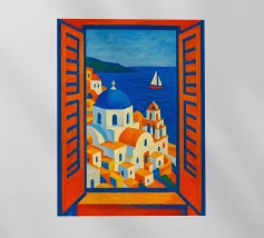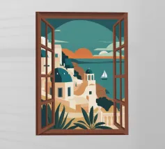 Una vista pittoresca dei classici edifici a cupola blu di un'isola greca come Santorini, visti da una finestra ad arco. Questa splendida scena cattura perfettamente il fascino idilliaco di una vacanza nel Mediterraneo.