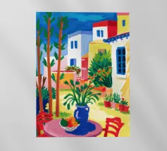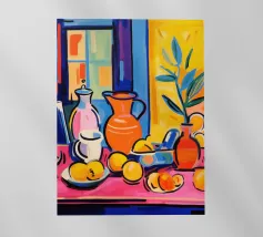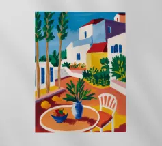 Una splendida natura morta di frutta fresca e bevande su un tavolo apparecchiato su un balcone, con una vista pittoresca di una classica città di mare del Mediterraneo. La scena è una fuga idilliaca e vibrante, che cattura perfettamente l'essenza di una vacanza sulla costa.