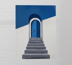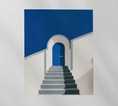 Scala bianca scolpita con curve organiche e pareti strutturate, immersa nella luce sotto un cielo blu intenso, in uno stile mediterraneo minimalista. Una tavolozza di luce bianca e azzurra, ideale per un arredamento contemporaneo, raffinato e architettonico. Perfetta per un soggiorno, una camera da letto o un ufficio creativo, per creare un'atmosfera estiva calma e stimolante.