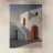 L'architettura del cortile è immersa in una luce dorata, con scale geometriche, archi arrotondati e pareti bianche strutturate in uno stile mediterraneo minimalista.
