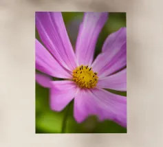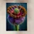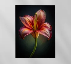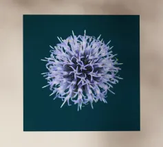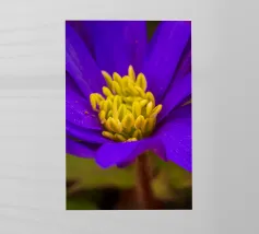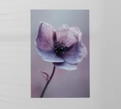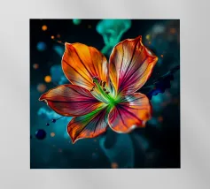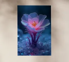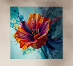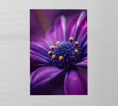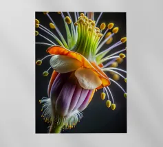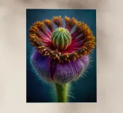 Una ripresa macro cattura i dettagli intricati di un fiore di papavero. Il fiore presenta petali viola, un centro rosso e un pistillo verde. Gli stami arancioni circondano il centro. Lo sfondo è di un blu scuro sfocato. L'immagine mette in evidenza le trame delicate e i colori vivaci del fiore.
